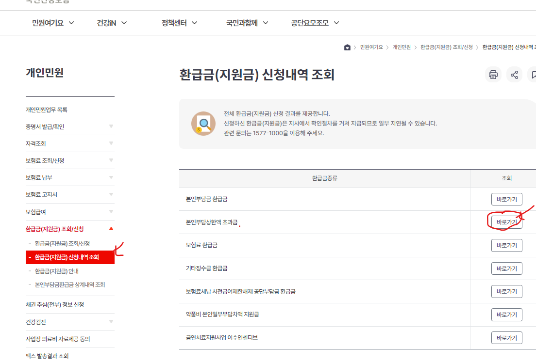 국민건강보험공단 사이트 방문 → 환급금 신청내역 조회 → 본인부담상환액 초과금 결정내역 및 지급내역