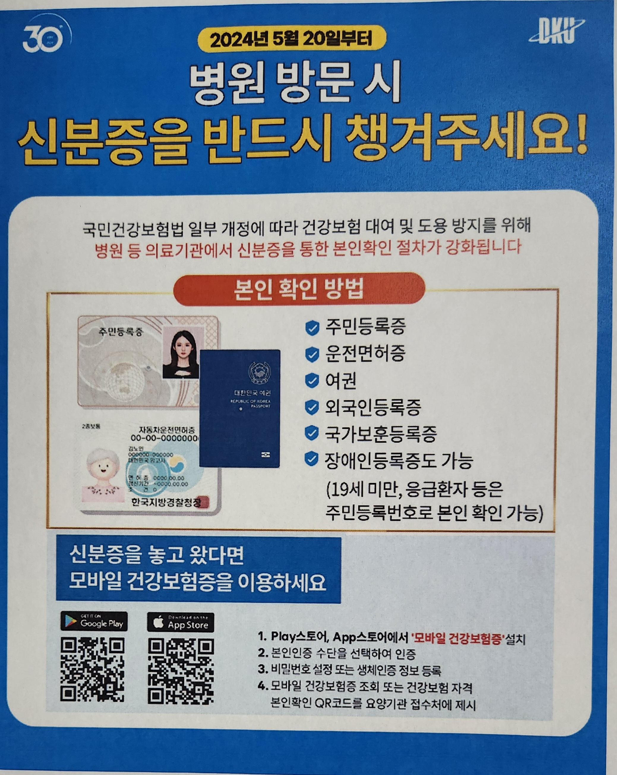 2024년 5월 20일 이후로 모든 의료 기관에서 진료를 받기 위해서는 본인 확인을 위해서 주민등록증, 운전면허증, 여권, 외국인등록증, 국가보훈등록증, 장애인록증 등 자신의 신분을 증명 할 수 있는 것을 제출 해야 진료를 받을 수 있다고 합니다.